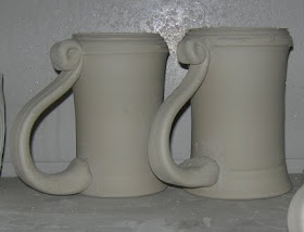 A new style of mugs from what I normally make. I liked throwing them but I'm not sure about the handles yet. The curl at the bottom is what I'm not sure of on the handle. I'll see what it looks like when I glaze it.