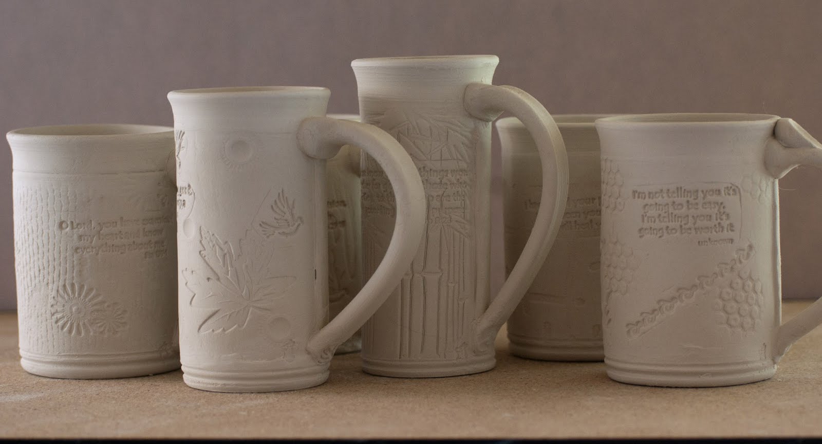 My first set of Days of Grace mugs are out of the kiln and fired. I'm very happy with the first firing. I have a few updates to make to the templates and I know the smallest font I can use now with these glazes. I have them up on my ETSY store or on my website for more pictures.