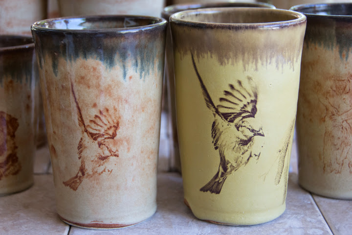 All clay and glaze below is Laguna B-Mix C5 with grog. Glaze is Coyote Clay Shino glaze with Espresso Bean on the rim. Decals were printed on Fired-On Decal transfer paper.